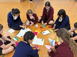 12月19日(木)、大水恵一神父様をお迎えしてクリスマス会が行われました。ハンドベル部の演奏に続き、3年生が聖劇「喜びの知らせ」をお捧げしました。「わたしは星役をいただきました。星役は出番が多く、舞台上の移動が多いので大変な役でした。でも、聖劇は、どの役を与えられても神様に胸を張ってお捧げしたいと思い、がんばって練習してきました」という3年生の作文がありました。大水神父様からは、「もっている一つの物をみんなで分け合うときに喜びや幸せが生まれる」というお話があり、クリスマスの意味について考えること