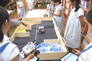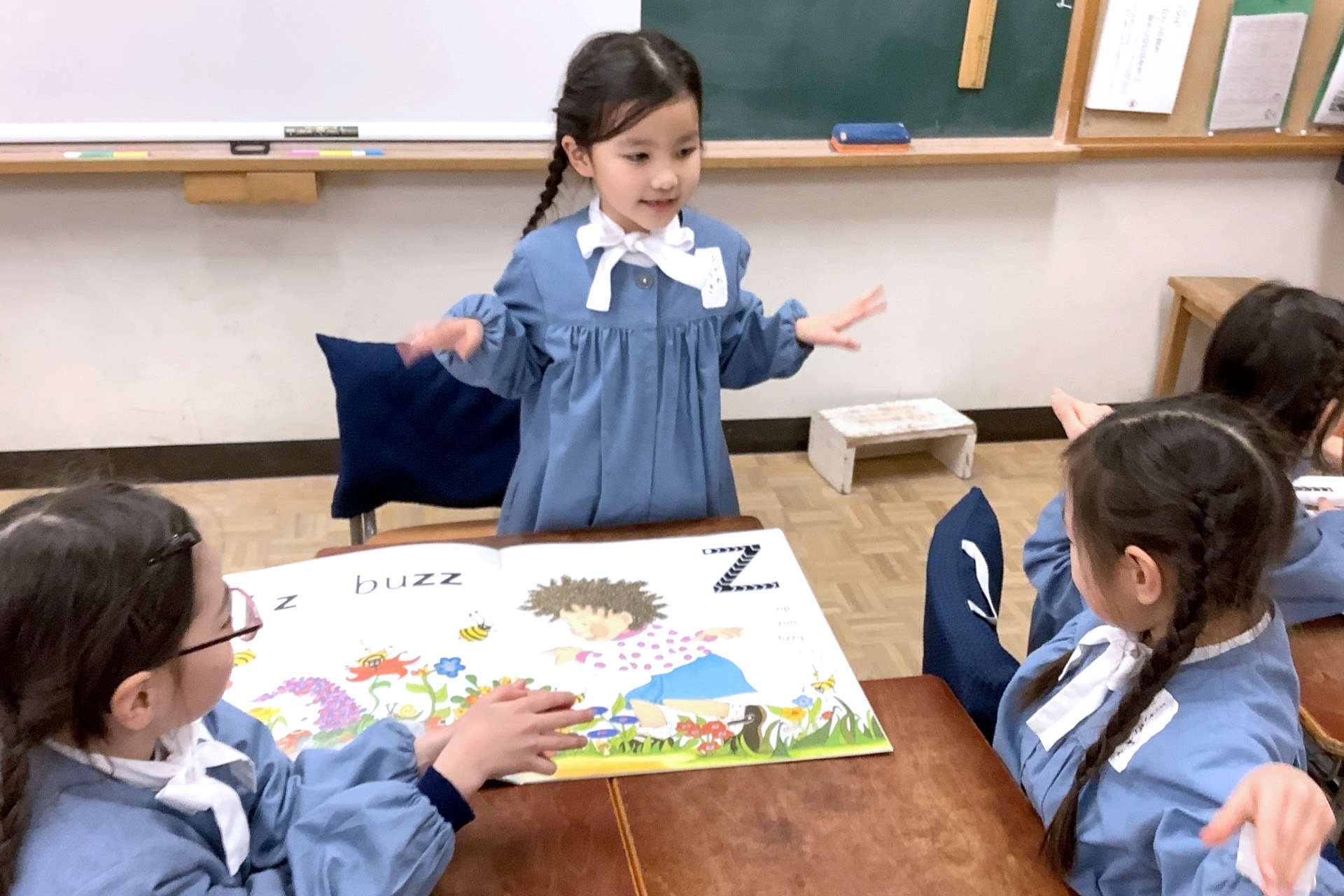 1年生から週に3回授業があります。ネイティブ教員と日本人の英語教員によるコミュニケーションの授業を行っています。低学年では、フォニックスを中心とした音声の授業を行い、中学年・高学年と段階的に表現活動を取り入れています。6年生になると、英語でのプレゼンテーションに取り組み、総合的な英語力を養います。