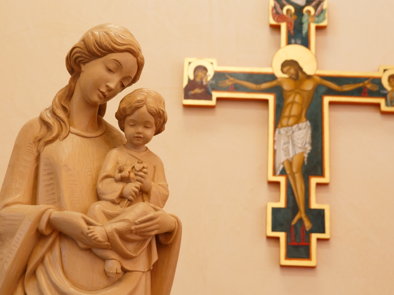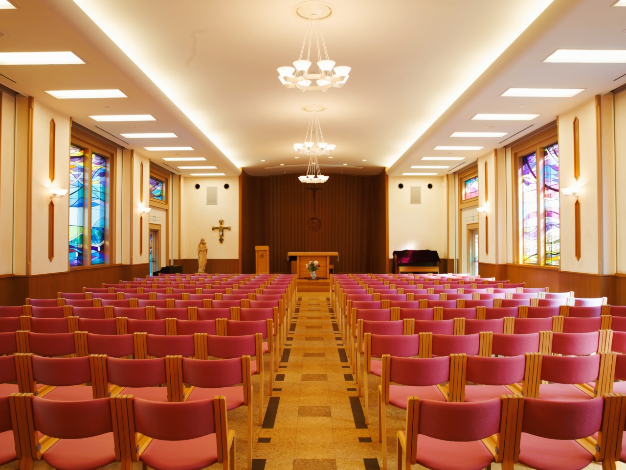 正面玄関に入ると、目の前に両手を広げた聖母マリアのご像が出迎えてくださいます。