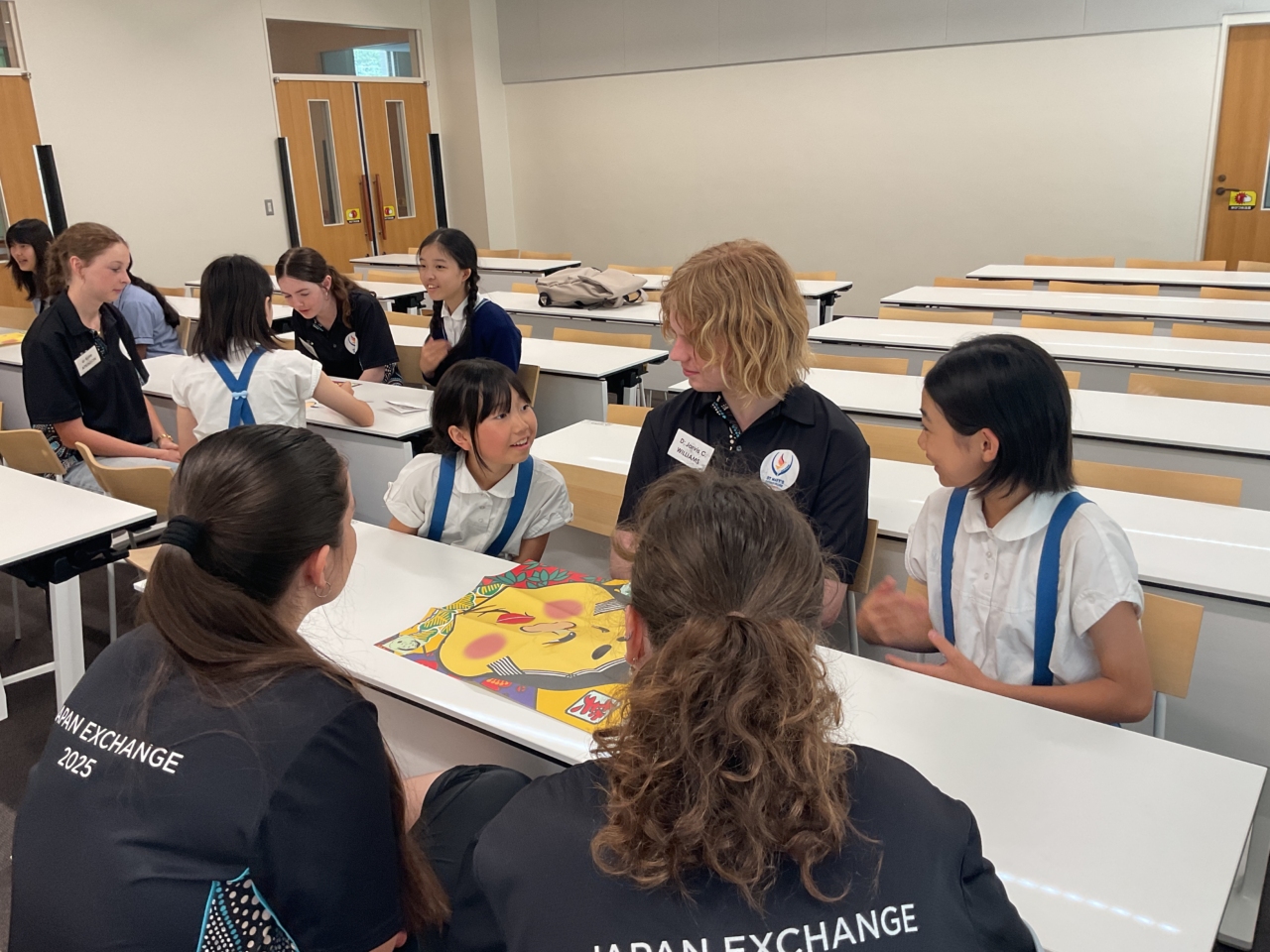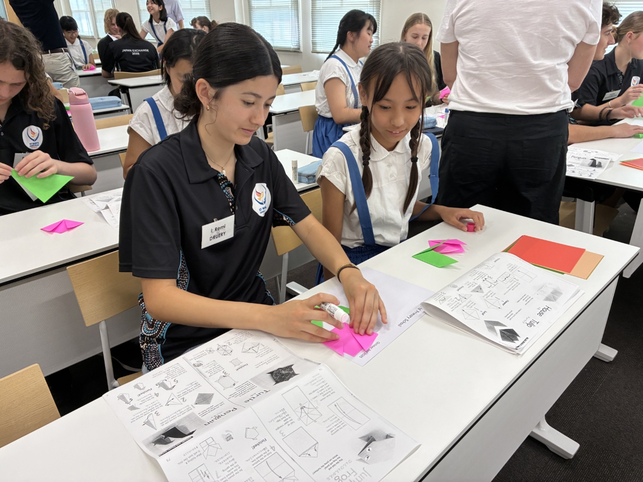 10月2日(木)、オーストラリアからの留学生が小学校に来てくれました。海星では、夏休み中に高1の生徒がオーストラリアにホームステイをし、2学期にはセント・メアリーズ高校から生徒が来校されます。今回は、その一環として、19名の生徒さんと3名の先生方をお迎えしました。小学校では、6年生が交流の時間を持ちました。英語の時間を活用し、折り紙や福笑いなどの日本の遊びを一緒に楽しみました。自己紹介では、好きな食べ物やスポーツなどについて英語で話し、笑顔あふれるやり取りが見られました。今回の経験が子どもたちの視野を広げ、これからの学びにつながっていくことを願っています。