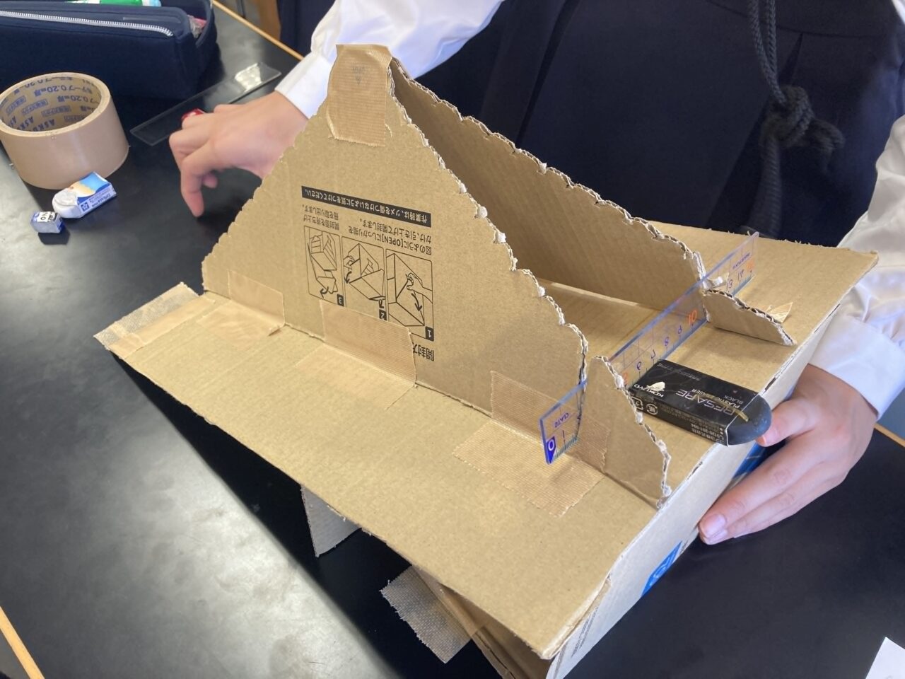 同じく様々な消しゴムを用いた班に、自作の段ボール装置で実験している班もありました。
