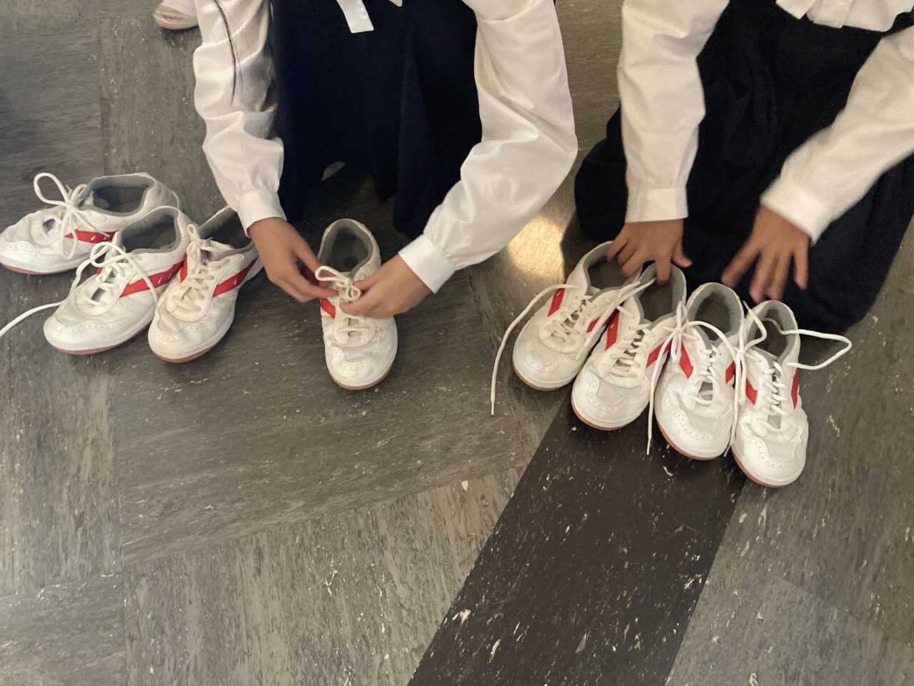 また、自分たちの体育館シューズの足サイズ(滑る物体の表面積)の違いで実験している班もありました。
