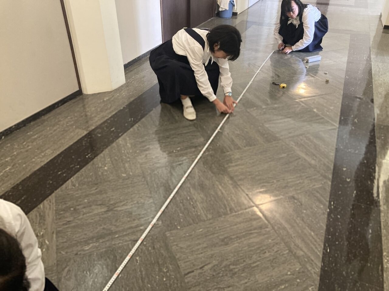 物理室を飛び出して、長い大理石の廊下を広く使い、輪ゴムでおもりを飛ばしている班もありました。