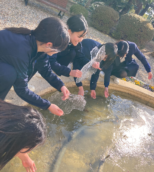 5限、持久走を終えて、噴水前で大騒ぎ。