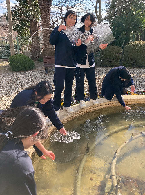 噴水に氷が張っていることに大喜び。冷たいのに氷を持ち上げて嬉しそうにはしゃいでいました。