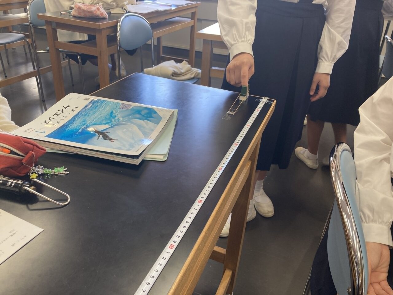 中1の理科で、面白い実験が行われていました。 摩擦力の違いはどのように生じるか、自分たちで実験を組み立てています。 上の班は、輪ゴムでいろいろな種類の消しゴムを飛ばし、その距離を測っています。 カバーが付いていたり、重さが違ったり、形が違ったり……その違いによって飛距離が変わってきます。 同じく様々な消しゴムを用いた班に、自作の段ボール装置で実験している班もありました。 また、自分たちの体育館シューズの足サイズ(滑る物体の表面積)の違いで実験している